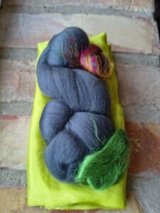 Det färdiga sjal av merinoull & silke fiber tovat på ett vackert sidentyg blir runt 40 x 200 cm.