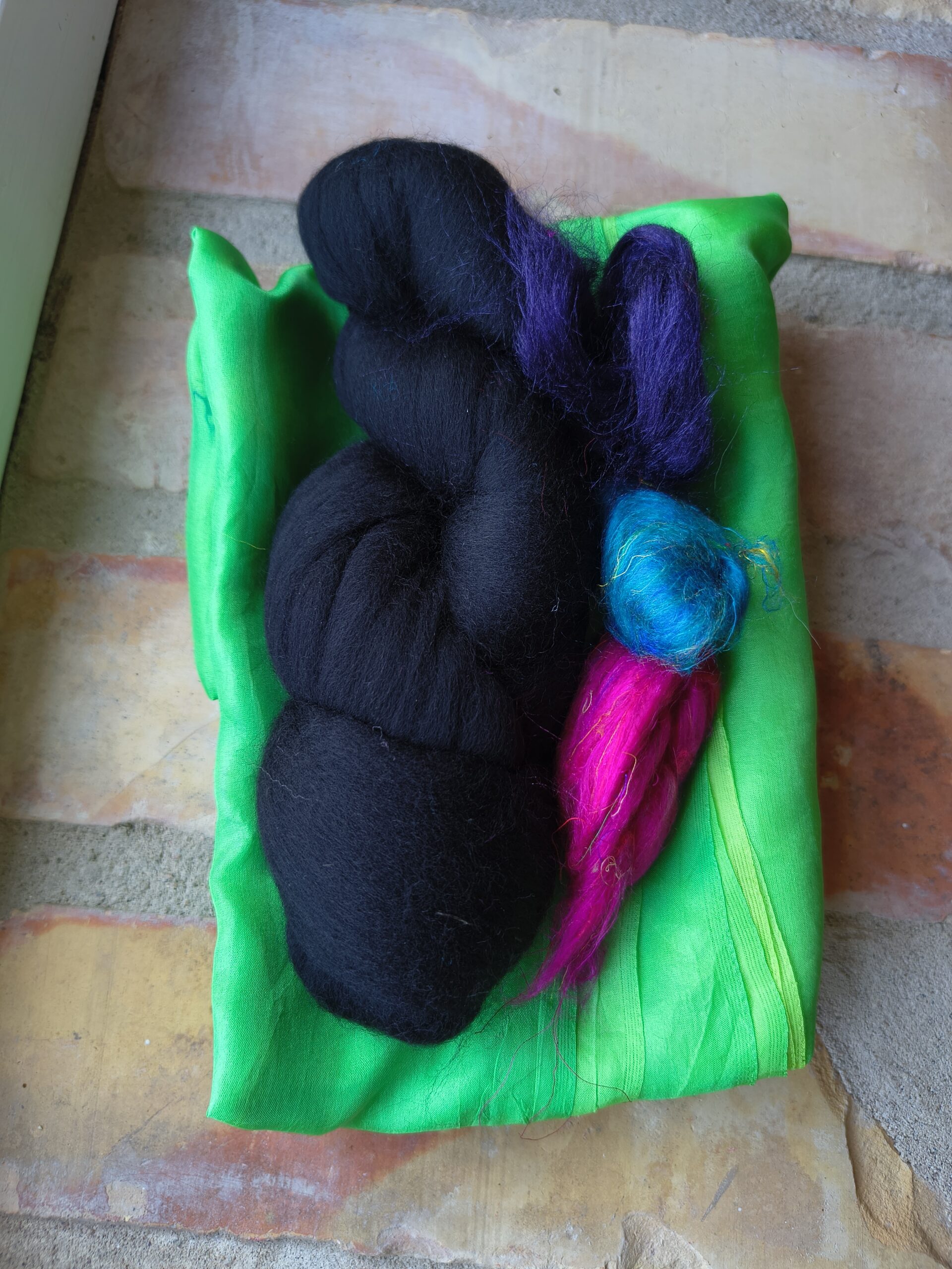 Innehåll: 3m x 45cm sidentyg, Merinoull 19 mic,  dekorationsfiber (av silke, sarisilke, viskos, lin eller hampa) + instruktion i text + bild.