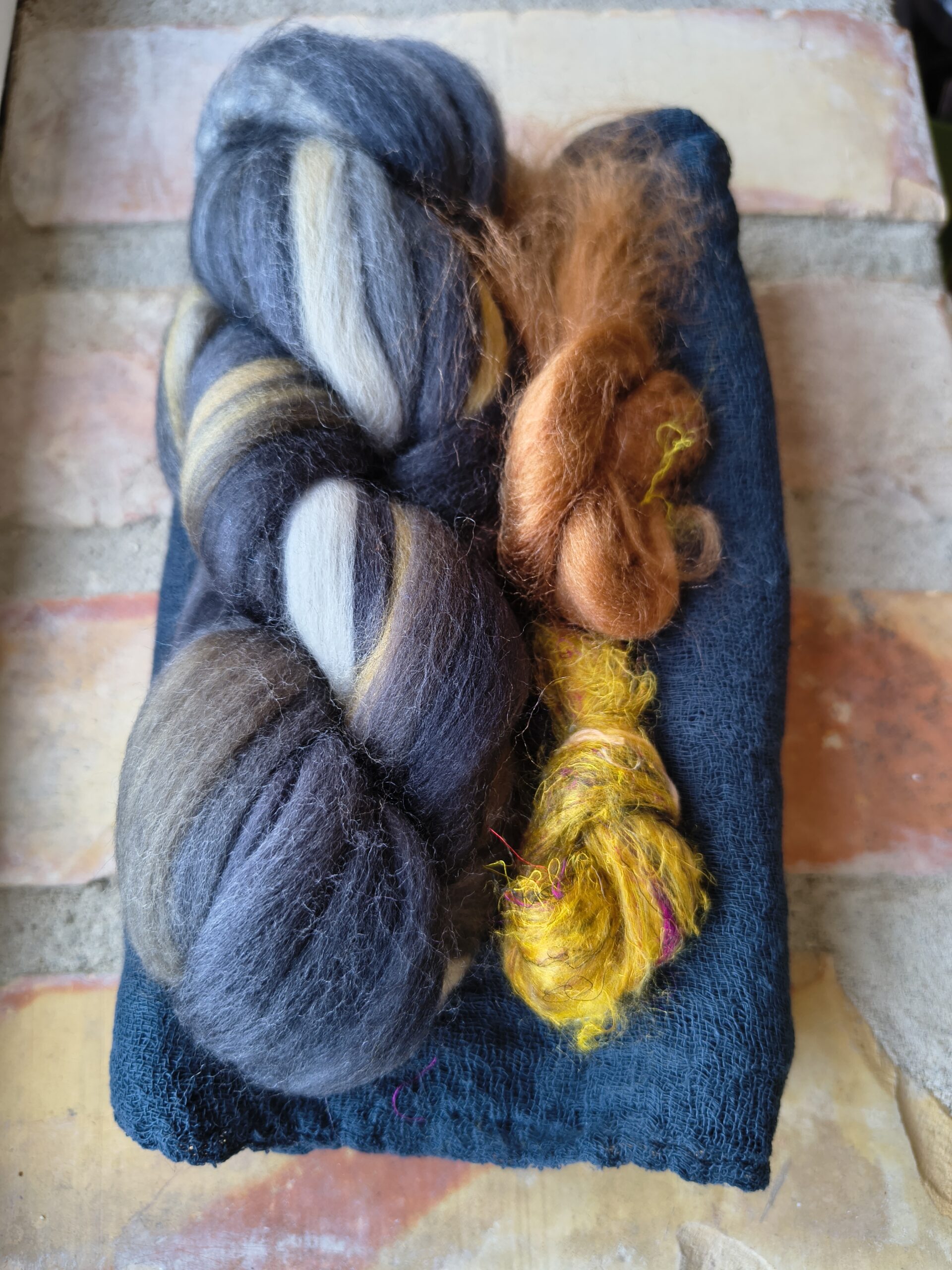 Innehåll: 3m x 45cm handfärgad gasväv av bomull, Merinoull 19 mic, 2 x dekorationsfiber (av silke, sarisilke, viskos, lin eller hampa) + instruktion i text + bild.