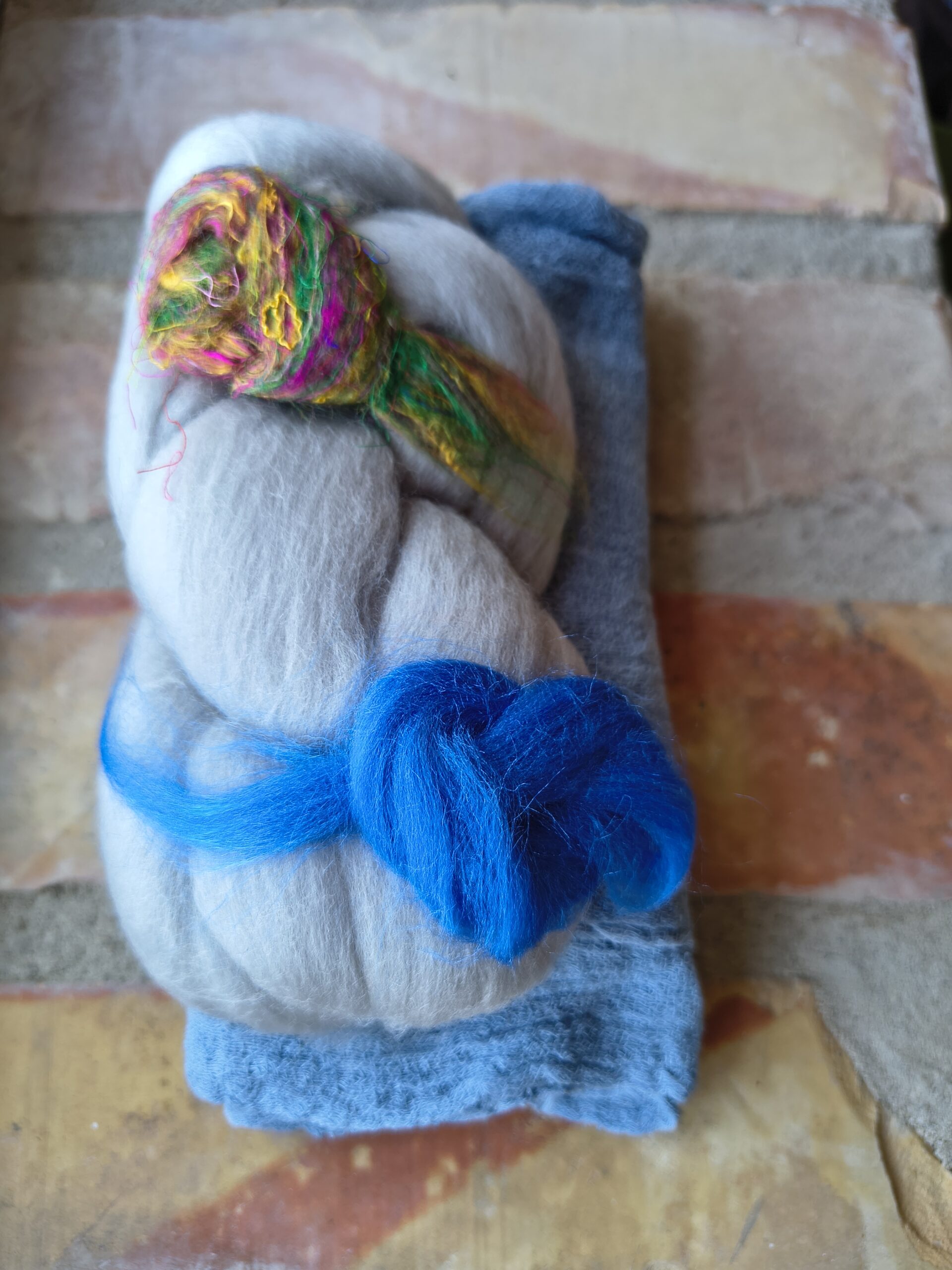Innehåll: 3m x 45cm handfärgad gasväv av bomull, Merinoull 19 mic, 2 x dekorationsfiber (av silke, sarisilke, viskos, lin eller hampa) + instruktion i text + bild.