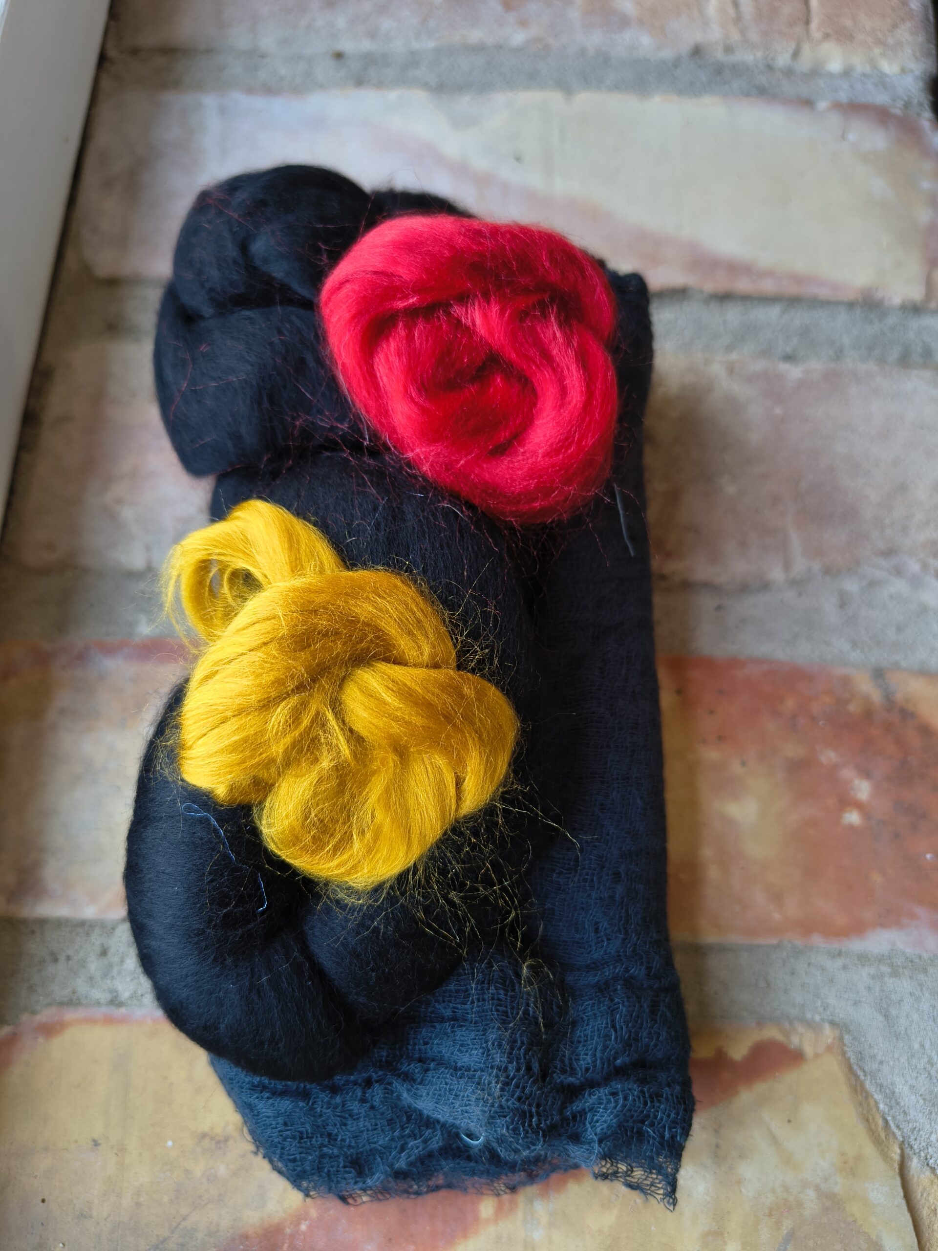 Innehåll: 3m x 45cm handfärgad gasväv av bomull, Merinoull 19 mic, 2 x dekorationsfiber (av silke, sarisilke, viskos, lin eller hampa) + instruktion i text + bild.