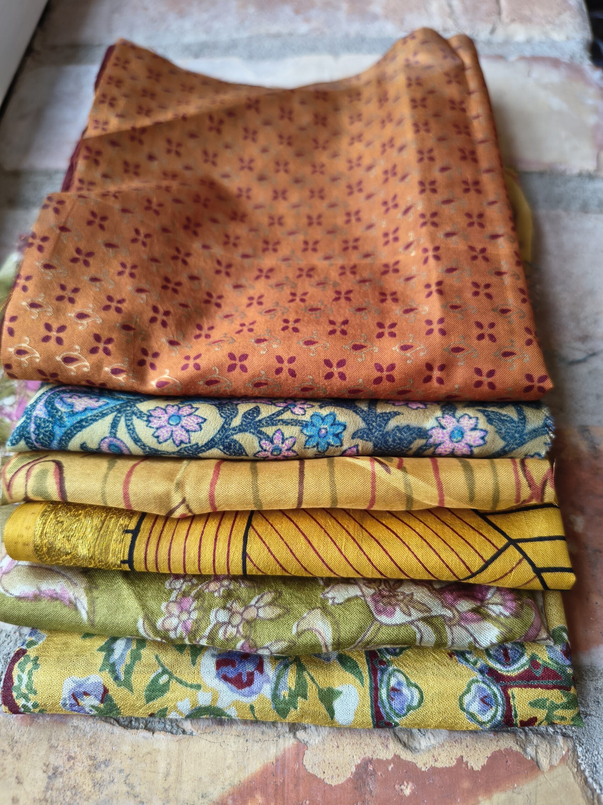 Här får du mycket fint sidentyg för pengarna. Vackra mönstra, färgar och bling på köpet.