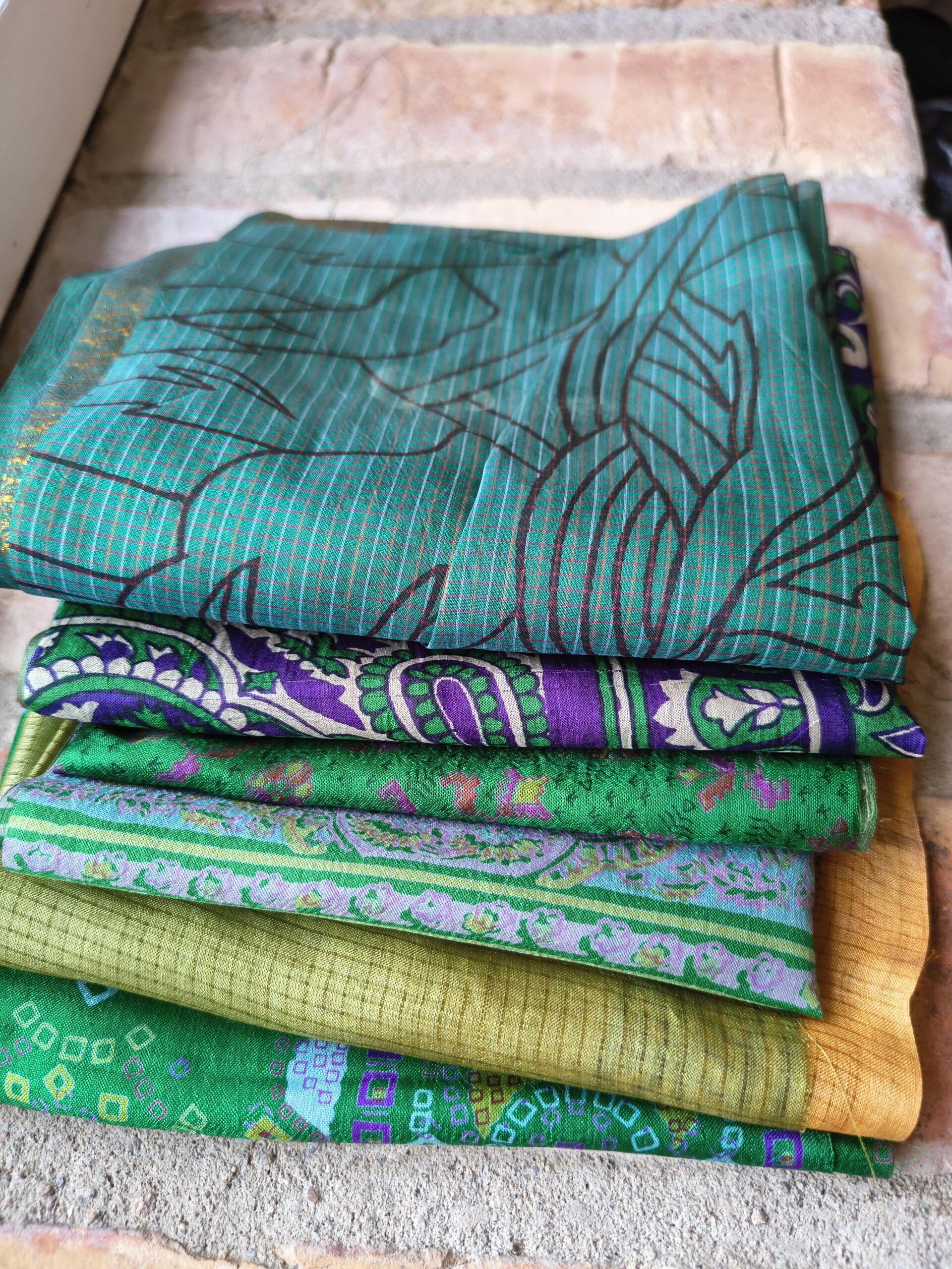 Här får du mycket fint sidentyg för pengarna. Vackra mönstra, färgar och bling på köpet.
